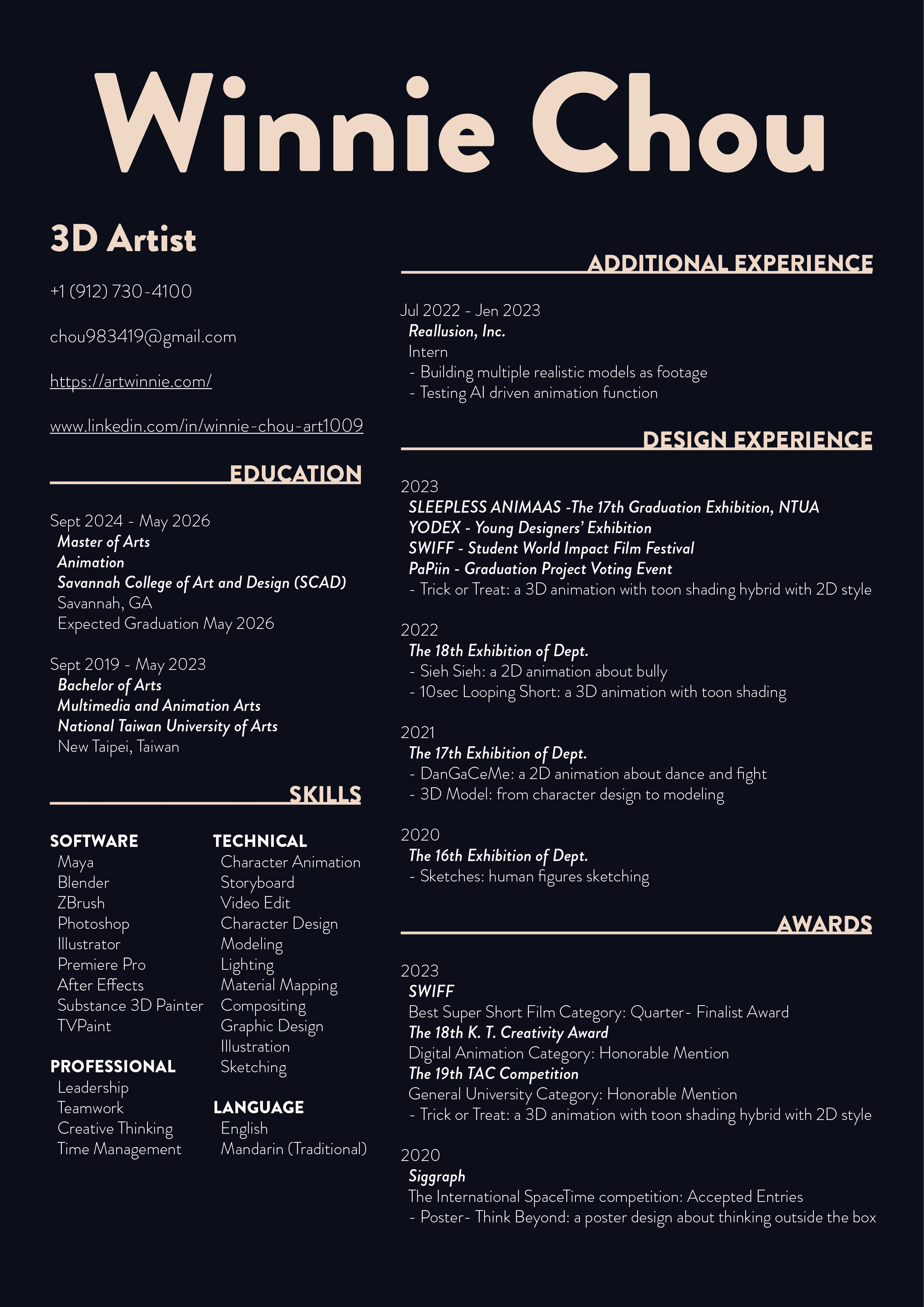 Hi! This is Winnie, a 3D artist earned a bachelor’s degree in Animation and currently pursues a master’s degree in Savannah College of Art and Design. I am highly interested in storytelling, and specialized in character animation. With experience of completing a project as a director, strong problem-solving ability, and interpersonal skills showed the capability of cooperation and leadership.